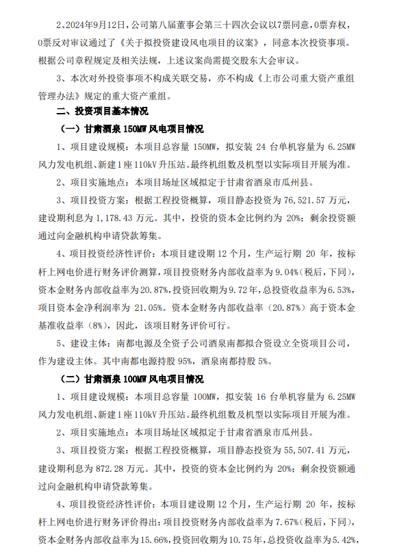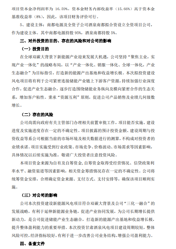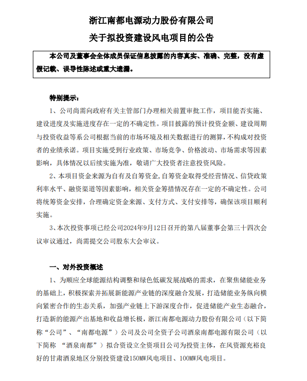 9月13日,南都电源发布关于拟投资建设风电项目的公告。