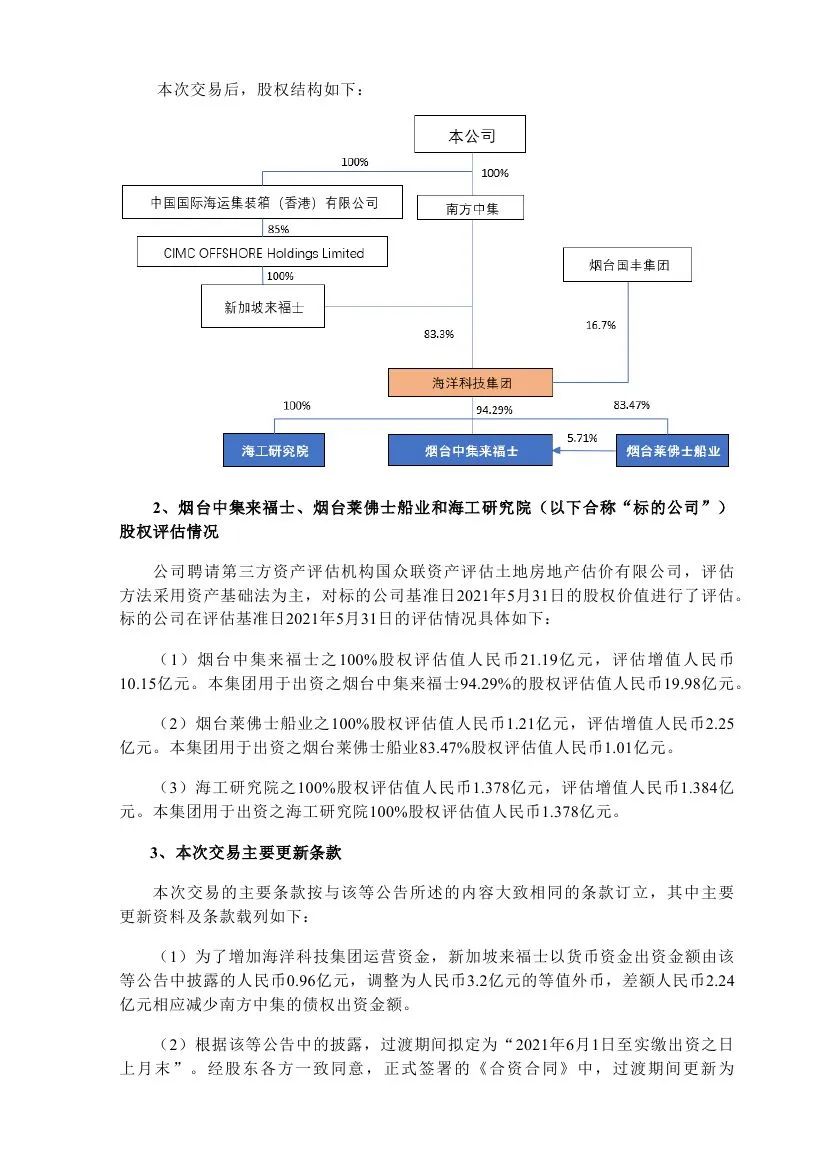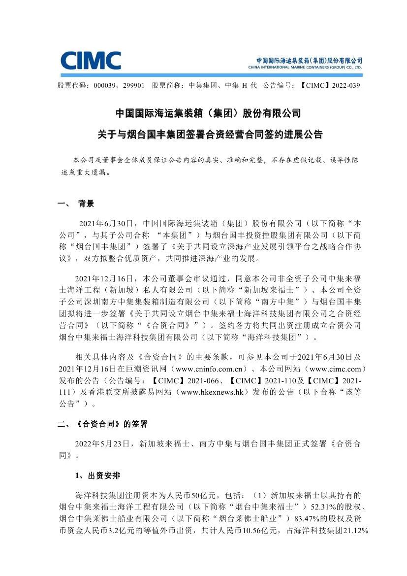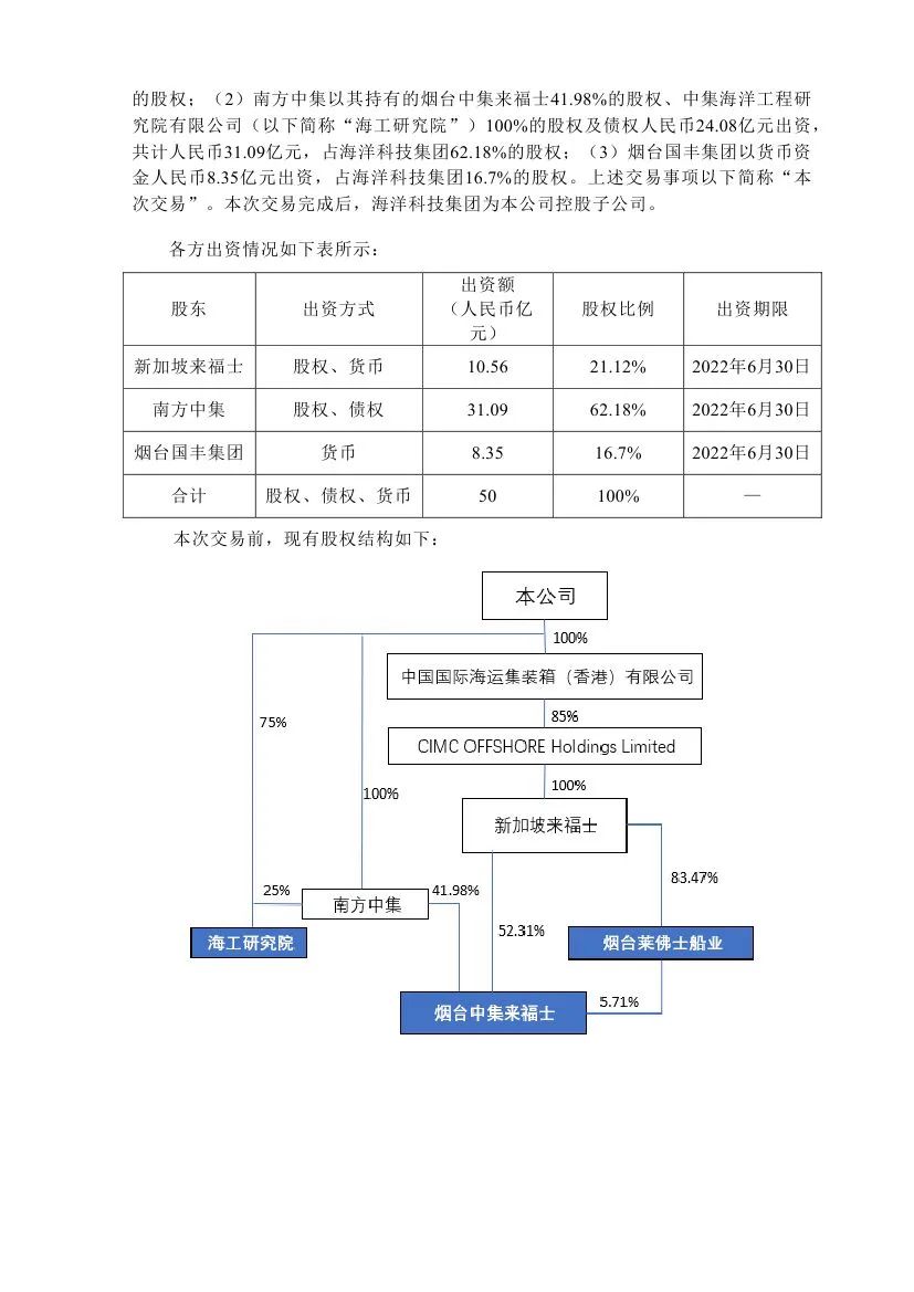 5月23日,新加坡来福士、南方中集与烟台国丰集团正式签署合资合同,将在今年6月30日前完成出资成立海洋科技集团,注册资本为50亿元。其中,南方中集货币出资增加至3.2亿元。