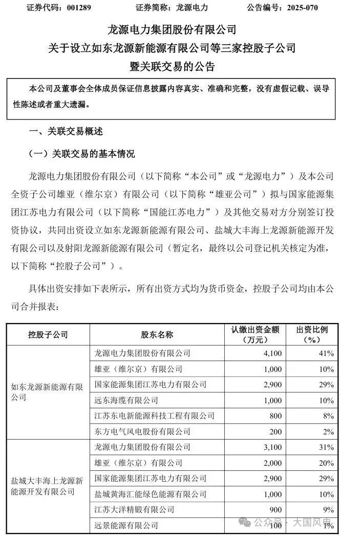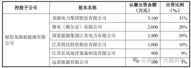 2. 射阳龙源新能源有限公司:龙源电力出资0.31亿元占股31%,远景能源出资100万元占股1%,其余股份由雄亚(维尔京)有限公司等4家公司持有,对应射阳海上南区H7#75万千瓦风电项目。