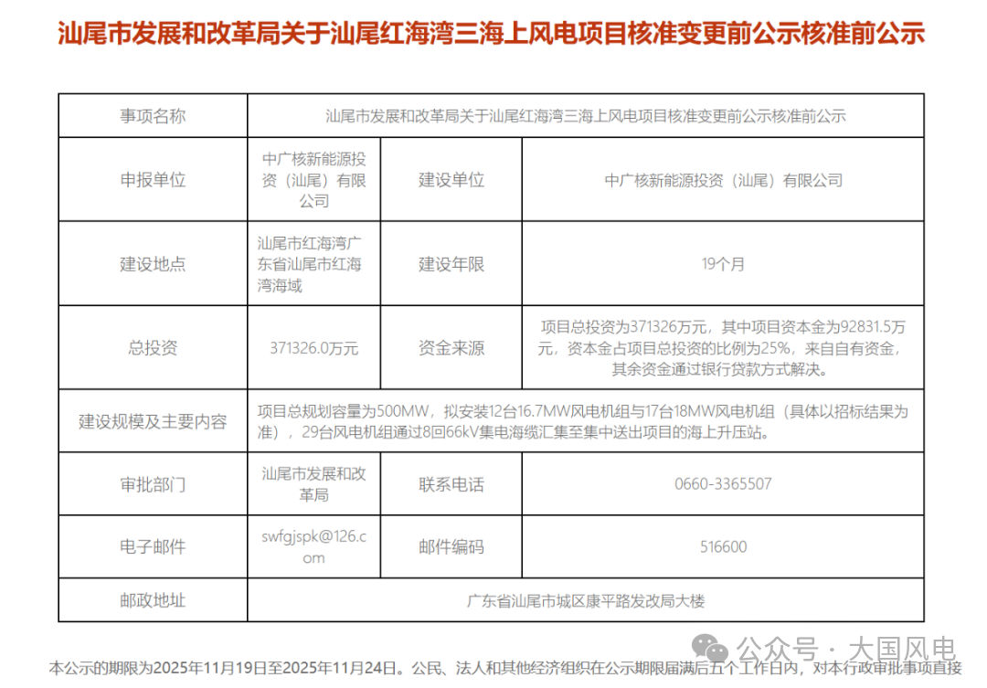 近日,广东汕尾市发展和改革局发布《关于汕尾红海湾三海上风电项目核准变更前公示核准前公示》。